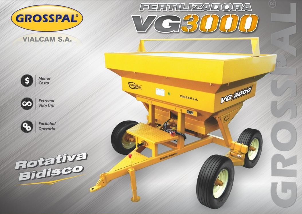 FERTILIZADORA ROTATIVA VG 3000: Máquina práctica y de utilización muy sencilla; mínimo mantenimiento, larga vida útil y calidad en la aplicaciónson sus características más sobresalientes. Funciona con gran precisión cubriendo un ancho aproximado de labor de 18 a 20 metros (urea granulada). Apta para todo tipo de fertilizantes sólidos (granulados).
